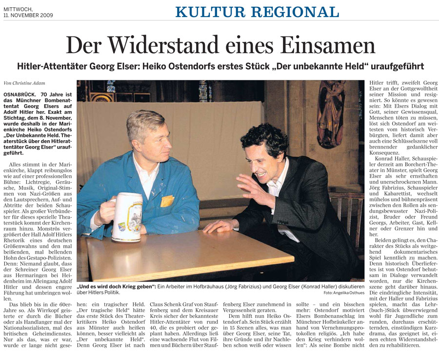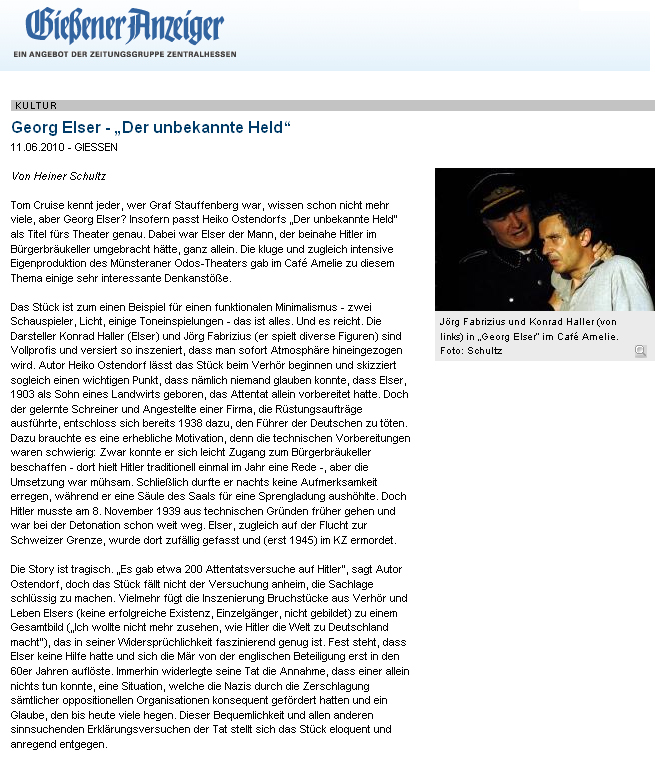 Als Georg Elser am 8. November 1939 beim illegalen Grenzübertritt in die Schweiz gefasst wurde, sprach Hitler noch im Münchener Bürgerbräukeller. Dann, nur wenige Minuten vor einer enormen Explosion, verließ der Führer das Gebäude. Acht Menschen kamen ums Leben. Nur der, dem der Anschlag gegolten hatte, war längst in Sicherheit. Dass Georg Elser dieses Attentat geplant und durchgeführt hatte, erkannte die Polizei erst später. Schließlich kam Elser ins Konzentrationslager Dachau, wo er kurz vor Kriegsende ermordet wurde. Nach dem Krieg ist Elser vergessen. Kaum jemand erinnert sich bis heute an die Tat dieses Mannes. Zwar gibt es eine Briefmarke mit Elsers Konterfei, einen Film und etliche Bücher, aber ihm wird lange nicht die Ehre zuteil, die Elser verdient hat. Dabei hat der Attentäter unvorstellbares geleistet. Seit Herbst 1938 hat er seine Tat ganz alleine vorbereitet und hat schon früh erkannt, dass Hitler Deutschland und die Welt in einen verhängnisvollen Krieg führen wird. Mit "Der unbekannte Held" präsentiert das theater odos in Kooperation mit dem Theater Osnabrük ein Theaterstück mit kurzen, prägnanten Szenen und tiefen psychologischen Momenten. Ob in Zwiesprache mit Gott in der Kirche oder mit der eigenen Tat im Verhör konfrontiert: Elser kämpft mit der Rechtfertigung seines Anschlags. War es wirklich richtig, Hitler töten zu wollen? Auf der Bühne setzen zwei Schauspieler das Stück in Szene. Konrad Haller spielt die Titelfigur. In die anderen Rollen schlüpft Jörg Fabrizius. Premiere: 8. November 2009 in der Kirche St. Marien in Osnabrück. Autor/Sounddesign: Heiko Ostendorf Schauspieler: Konrad Haller und Tilman Rademacher Pressestimmen: "Alles stimmt in der Marienkirche, klappt reibungslos wie auf einer professionellen Bühne: Lichtregie, Geräusche, Musik, Original-Stimmen von Nazi-Größen aus den Lautsprechern, Auf- und Abtritte der beiden Schauspieler... Die eindringliche Intensität macht das Lehr-(buch-)Stück überwiegend wohl für Jugendliche zum runden, durchaus erschütternden, einstündigen Kurzdrama, das geeignet ist, einen echten Widerstandshelden zu rehabilitieren." Neue Osnabrücker Zeitung (Den kompletten Artikel finden Sie hier.) "Georg Elser kniet vor dem Altar, hadert mit sich und fleht Gott um Hilfe an. Eine Szene, die in der Osnabrücker Marienkirche besonders authentisch wirkt. Der Autor Heiko Ostendorf ... schildert die Beweggründe Elsers abwechselnd aus zwei Perspektiven: In der Planungsphase vor dem Anschlag und rückblickend im Verhör ... Trotz der von der Ausstattung her minimalistischen Inszenierung mit nur zwei Schauspielern bekommt der Zuschauer eine Vorstellung von dem Menschen, der Hitler töten wollte, um den Krieg zu verhindern. Das liegt sicher auch an der schauspielerischen Leistung von Konrad Haller als Georg Elser." NDR Kultur "Beginnend mit dem Verhör nach der Festnahme erfährt der Zuschauer in Rückblenden die Gewissensqualen Elsers... Konrad Haller zeigt einen zerquälten und bei allen Zweifeln doch zunächst überzeugten Täter. Mit viel Beifall belohnten die Zuschauer den Autor und die beiden Schauspieler." osradio 104,8 "Theater Odos führt 'Der unbekannte Held' in der Gedenkstätte KZ Osthofen auf" Wormser Zeitung "Klassischer Fall von Tyrannenmord" Neue Westfälische "Theaterstück erinnerte an Georg Elser" Siegener Zeitung "Schauspielerische Verbeugung vor dem einsamen Helden" Westfälische Rundschau "Später Ruhm für Hitler-Attentäter Elser" Nürnberger Nachrichten "Georg Elser - 'Der unbekannte Held'" Gießener Anzeiger "Innere Zerrissenheit des Attentäters gut herausgearbeitet" Gießener Allgemeine "'Der unbekannte Held' gab viele Anstöße zur Diskussion" Gießener Anzeiger "Georg Elser - der unbekannte Held" Licher Wochenblatt |