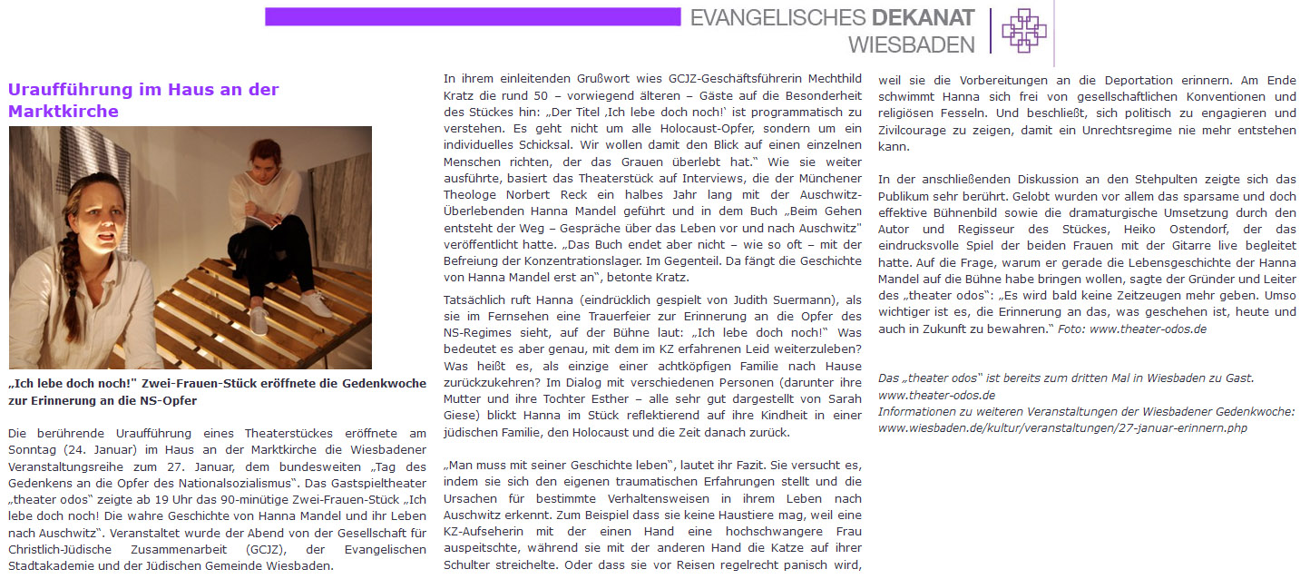 "Im Dialog mit verschiedenen Personen blickt Hanna auf ihr Leben zurück. Zwischen Fremdbestimmung und Selbstbestimmung. Sie wird regelrecht konfrontiert mit ihren eigenen Erinnerungen, manchmal wie in einem Kreuzverhör. Sarah Giese spielt einfühlsam diese Rahmenpersonen, die auch Hannas Gefühlswelt widerspiegeln. Die nachhaken, widersprechen, sie stärkend in den Arm nehmen. Bittere Mosaiksteine setzen sich zu Hannas Leben zusammen. Erklären zum Beispiel, warum sie nach dem Krieg keine Haustiere mag. Weil eine KZ-Aufseherin mit der einen Hand eine hochschwangere Frau auspeitschte, während sie mit der anderen Hand die Katze auf ihrer Schulter streichelte. Es sind diese Szenen, die sich einbrennen, die mit kargem Bühnenbild und sanft pulsierender Live-Musik (Ostendorf am E-Bass) 90 Minuten lang fesseln. Judith Suermann spielt Hanna mit jeder Faser ihres Körpers, unbeschwert fröhlich als Kind, desillusioniert in den KZ-Szenen, voller Hass bei der Befreiung und kämpferisch im hohen Alter. Ihr Gesicht ist gezeichnet vom Anblick fürchterlicher KZ-Gräuel. Doch ihre Stimme symbolisiert: Der innere Vulkan brodelt noch, sich für eine bessere Welt einsetzen zu wollen. Ostendorf ist ein wichtiges politisches Theaterstück gelungen, beklemmend und bereichernd zugleich, dass selbstkritisch die Holocaust-Thematik von ihrem Gedenk-Kitsch befreit und ein leidenschaftliches Plädoyer entwirft für eine humanere Gesellschaft." Westfälische Nachrichten (Den kompletten Artikel finden Sie hier.) "Die berührende Uraufführung eines Theaterstückes eröffnete am Sonntag, 24. Januar im Haus an der Marktkirche die Wiesbadener Veranstaltungsreihe zum 27. Januar, dem bundesweiten 'Tag des Gedenkens an die Opfer des Nationalsozialismus'. Das Gastspieltheater theater odos das 90-minütige Zwei-Frauen-Stück 'Ich lebe doch noch! Die wahre Geschichte von Hanna Mandel und ihr Leben nach Auschwitz'. Tatsächlich ruft Hanna (eindrücklich gespielt von Judith Suermann), als sie im Fernsehen eine Trauerfeier zur Erinnerung an die Opfer des NS-Regimes sieht, auf der Bühne laut: 'Ich lebe doch noch!' Was bedeutet es aber genau, mit dem im KZ erfahrenen Leid weiterzuleben? Was heißt es, als einzige einer achtköpfigen Familie nach Hause zurückzukehren? Im Dialog mit verschiedenen Personen (darunter ihre Mutter und ihre Tochter Esther – alle sehr gut dargestellt von Sarah Giese) blickt Hanna im Stück reflektierend auf ihre Kindheit in einer jüdischen Familie, den Holocaust und die Zeit danach zurück." Evangelisches Dekanat Wiesbaden (Den kompletten Artikel finden Sie hier.) "Mit einem stehenden Schlussapplaus bedankte sich das Publikum bei dem Theater Odos für die großartige Aufführung." Hessische/Niedersächsische Allgemeine (HNA) (Den kompletten Artikel finden Sie hier.) "Zwei innere Stimmen, 90 Minuten wirkungsvoll dargestellt von zwei leidenschaftlichen Schauspielerinnen. Sie brachten Hannas durcheinandergeratene Gefühlswelt ausdrucksvoll zur Schau und berührten das Publikum. Das karge Bühnenbild und die bedrückende Begleitmusik unterstützten die Wirkung des Stücks." Die Rheinpfalz (Den kompletten Artikel finden Sie hier.) |